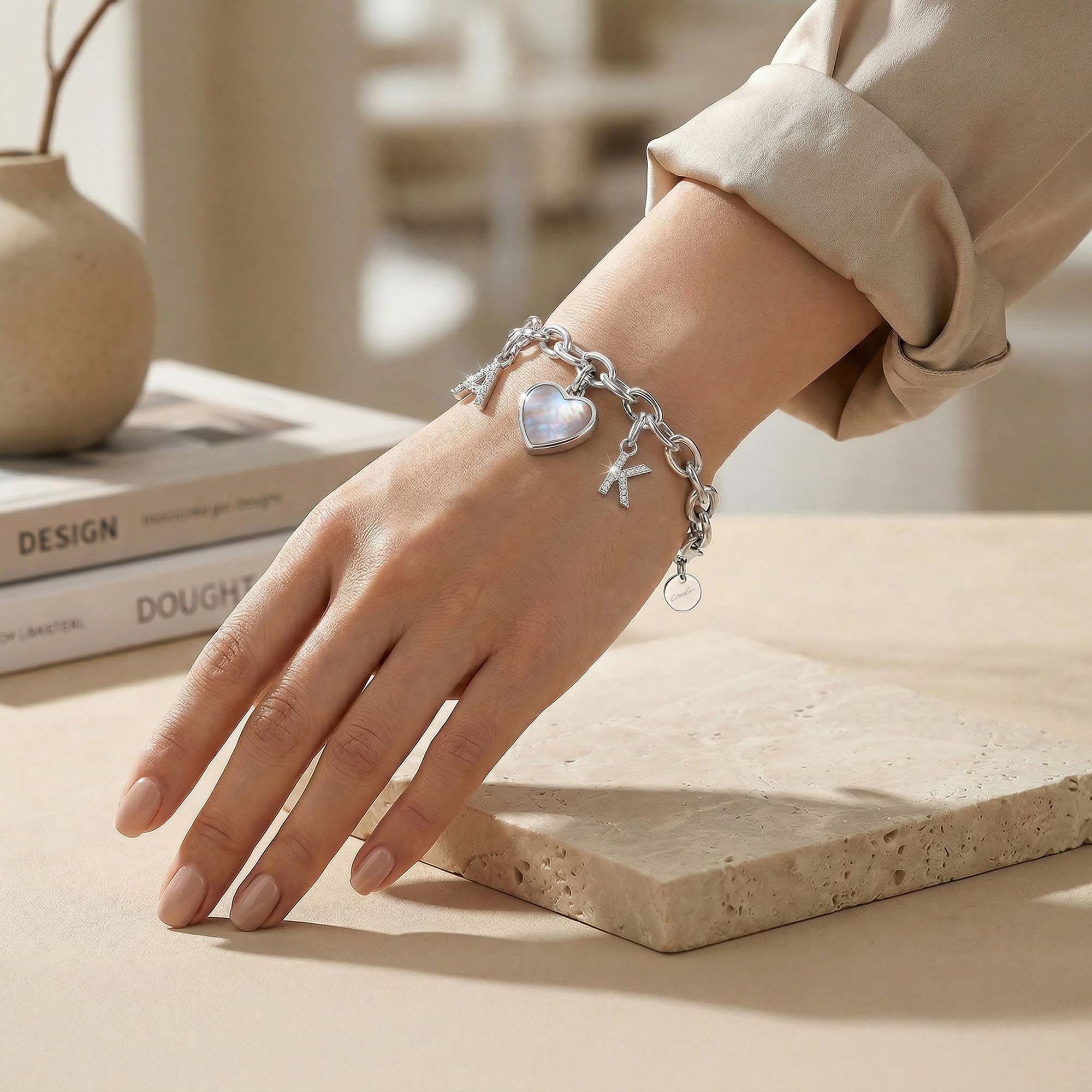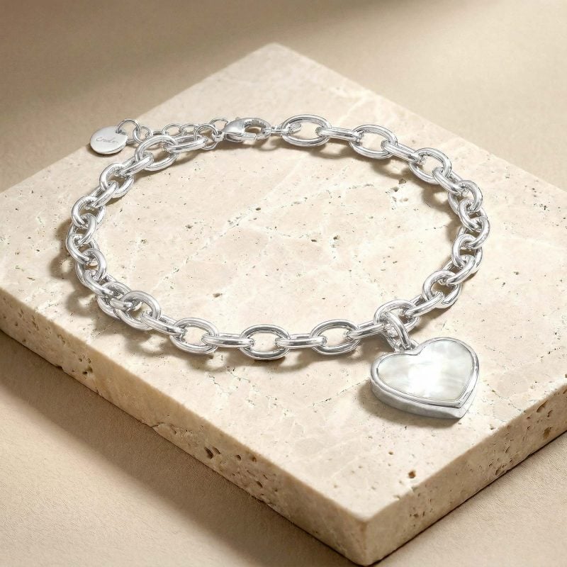 设计灵感源自母亲无私的爱,心型吊牌镶嵌着散发柔美虹光的天然贝母石,完美呼应她温婉包容的气质。手链以高品质西德钢精心锻造,不仅具备低敏特性,更拥有零负担的轻巧质感,展现毫不费力的日常优雅。