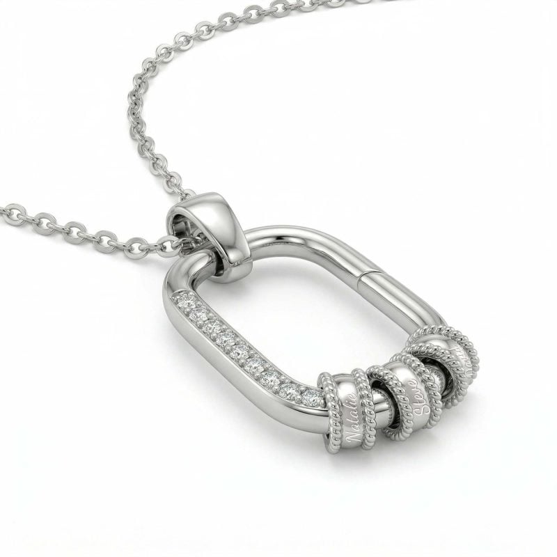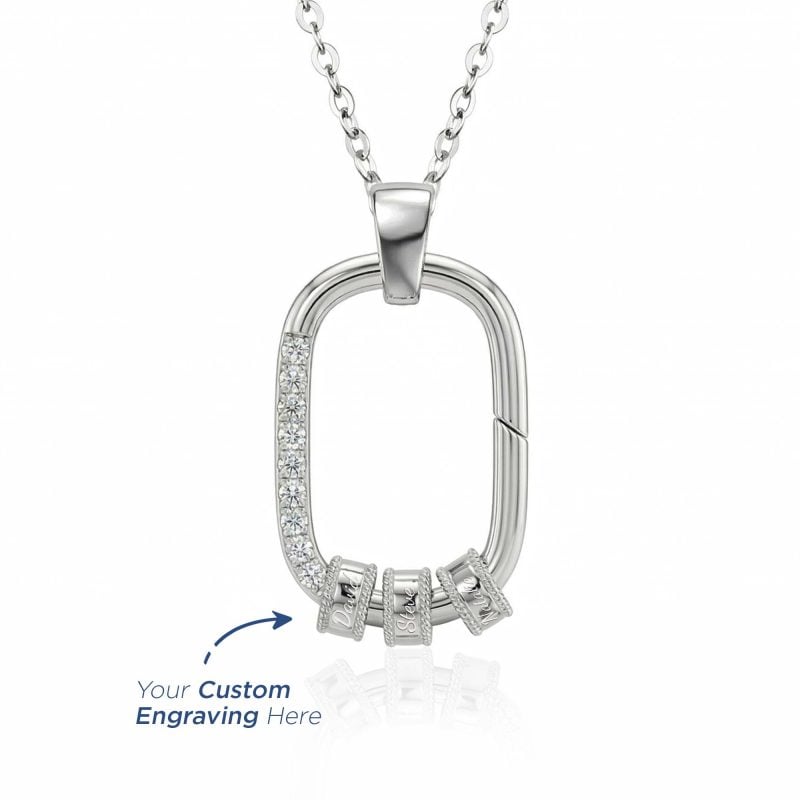 项链配有可灵活滑动的纯银小圆环,并提供专属的客制化刻字服务。您可以自由加配圆环数量,将子女的名字温柔镌刻其上,让这份最骄傲的爱意时刻贴近她的心房。