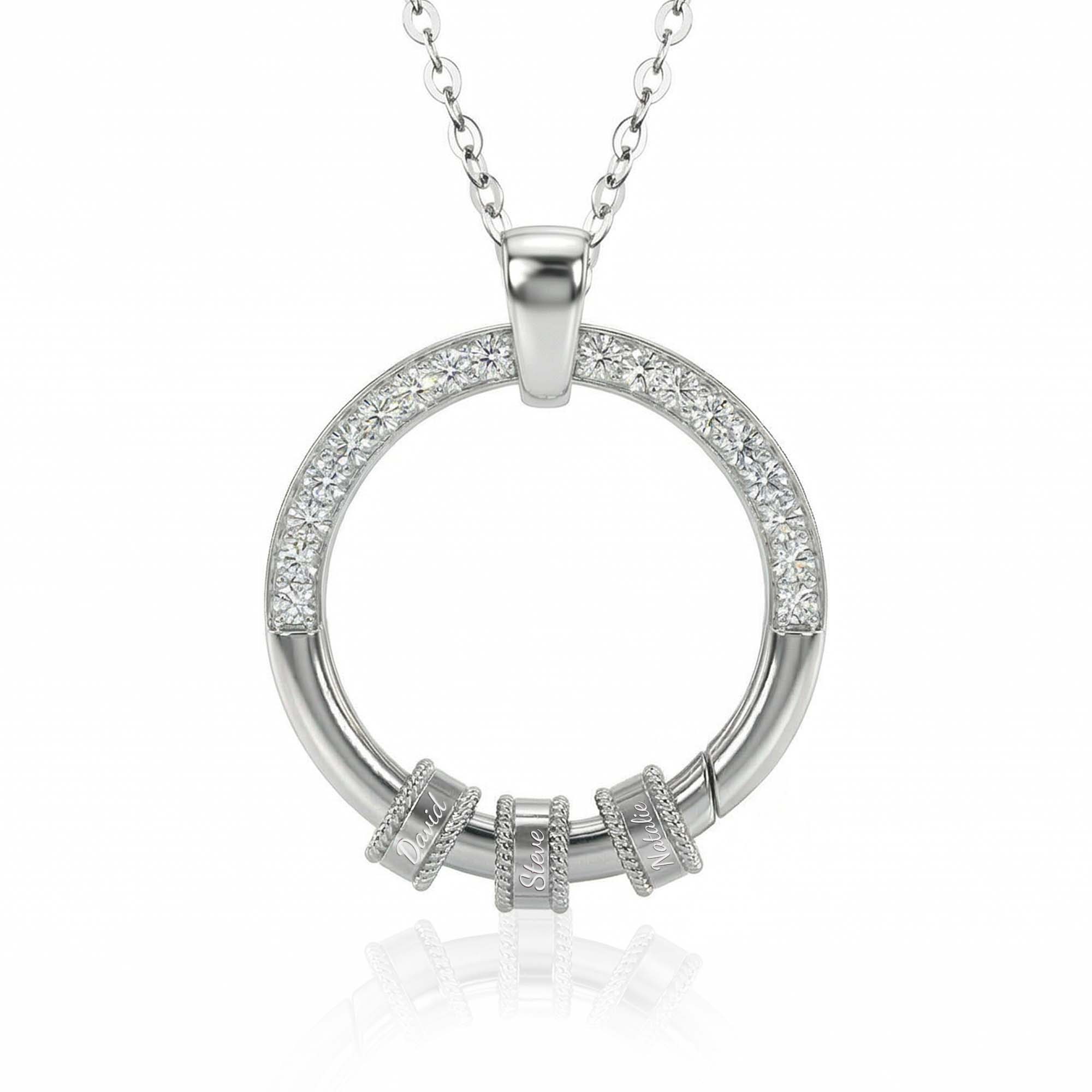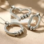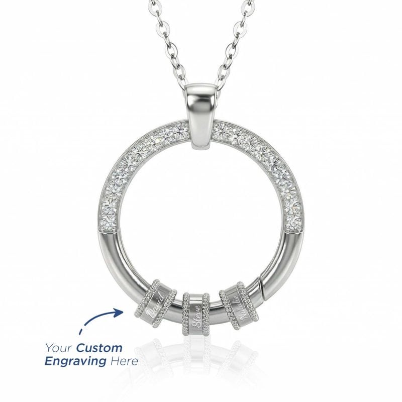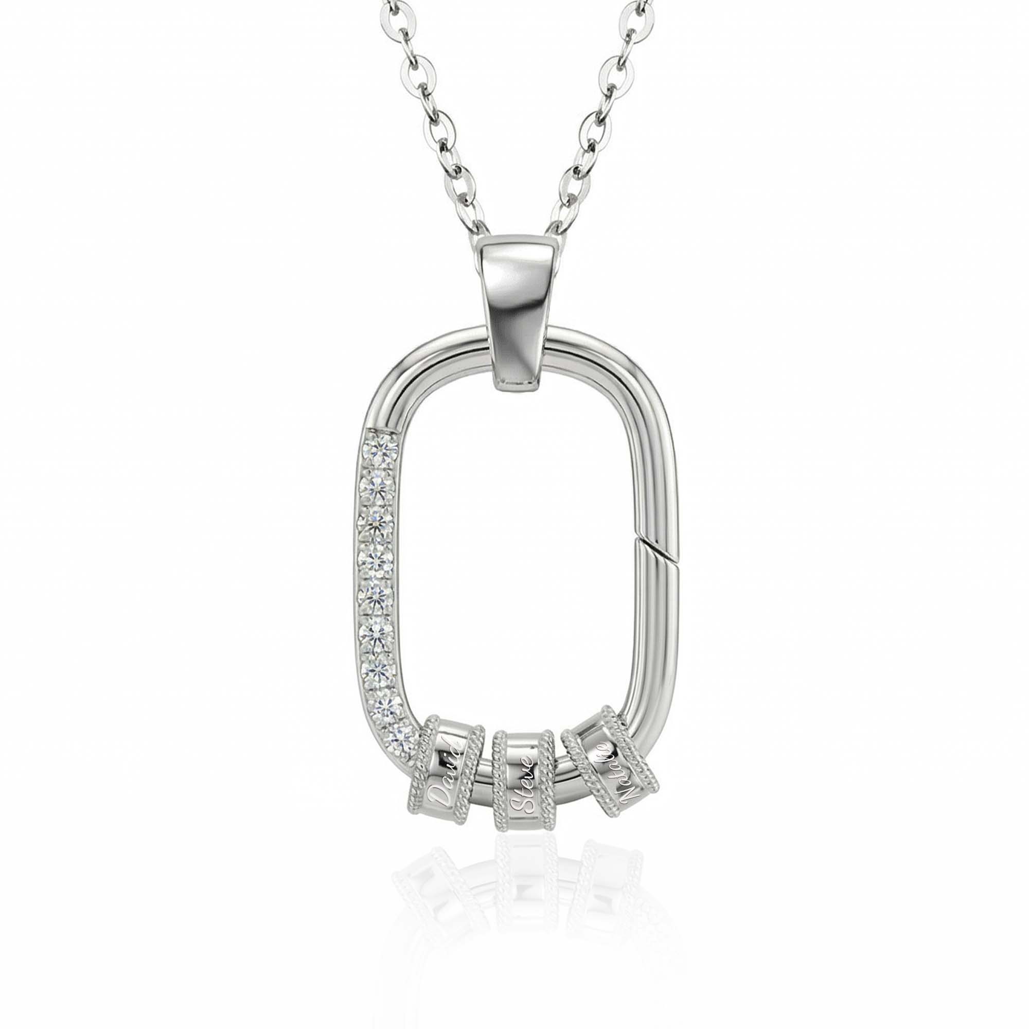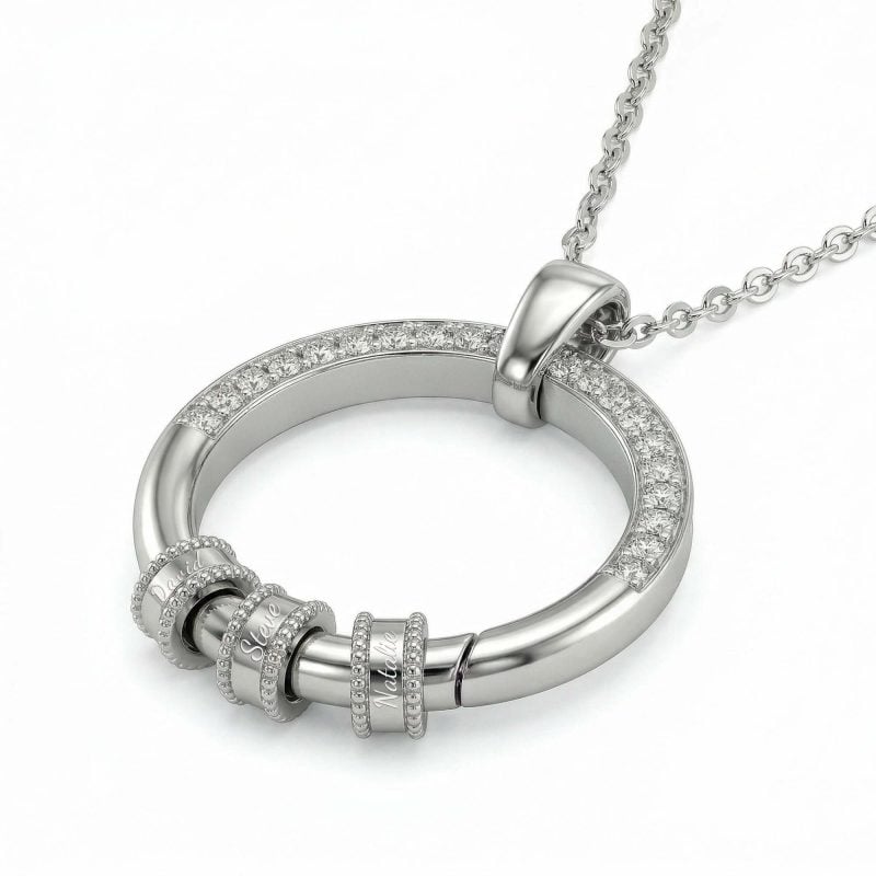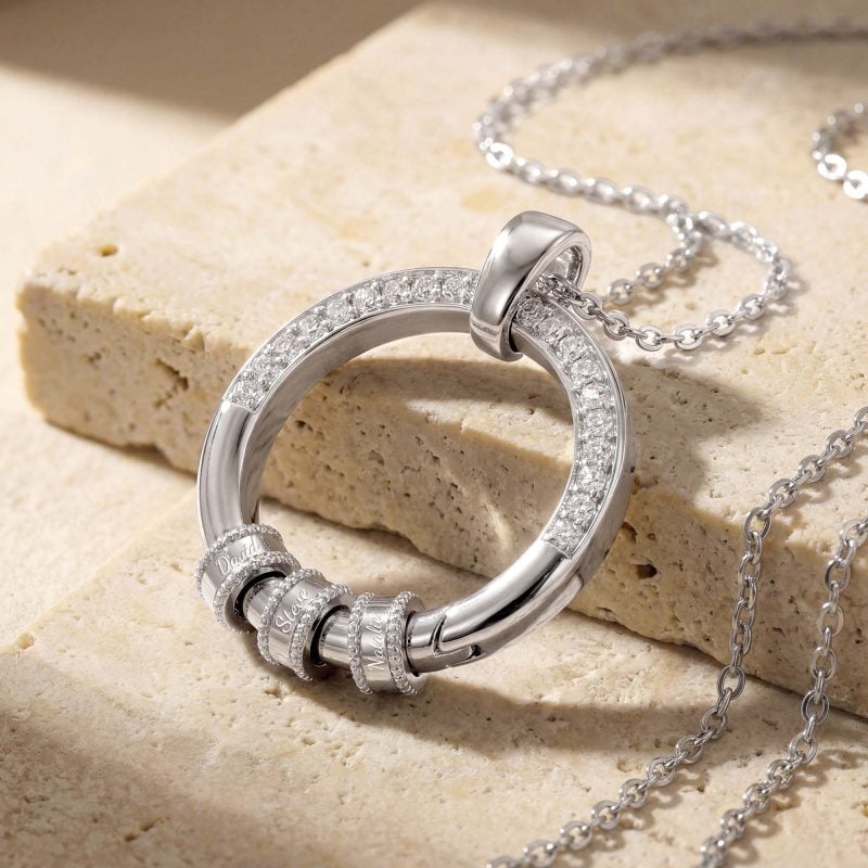 项链配有可灵活滑动的纯银小圆环,并提供专属的客制化刻字服务。您可以自由加配圆环数量,将子女的名字温柔镌刻其上,让这份最骄傲的爱意时刻贴近她的心房。