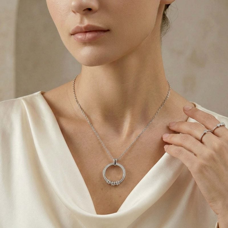 这款优雅的项链精准诠释了无可取代的亲情羁绊。以高品质925纯银精心锻造,闪耀的吊坠低调而奢华,完美衬托出母亲历经岁月沉淀的从容与温婉气质,适合她日常优雅佩戴。