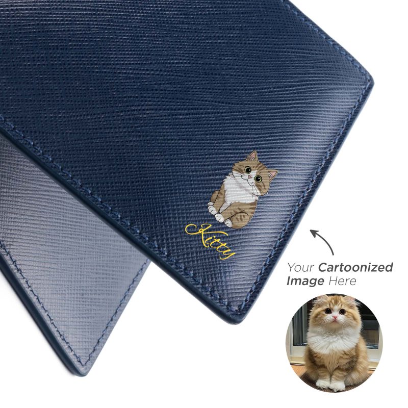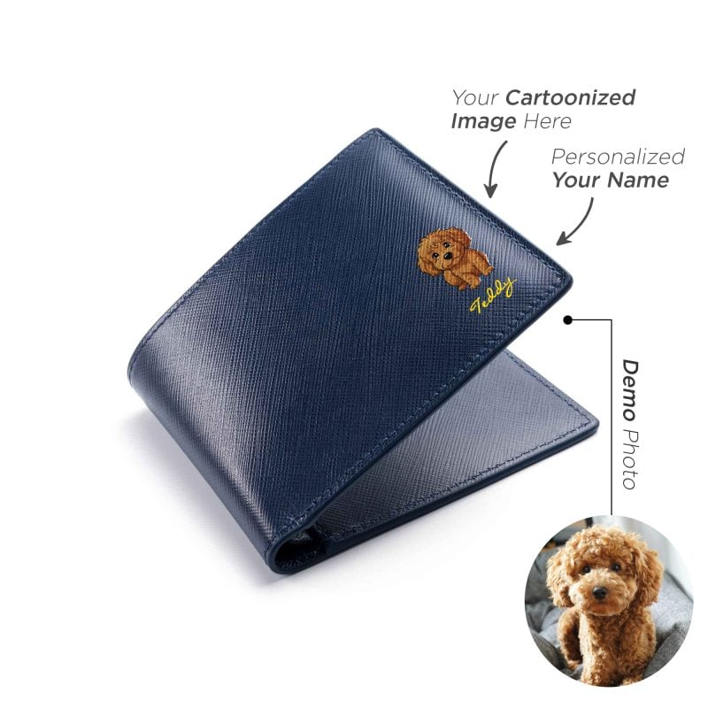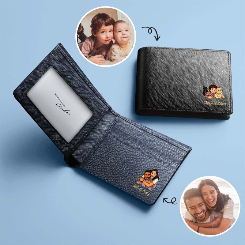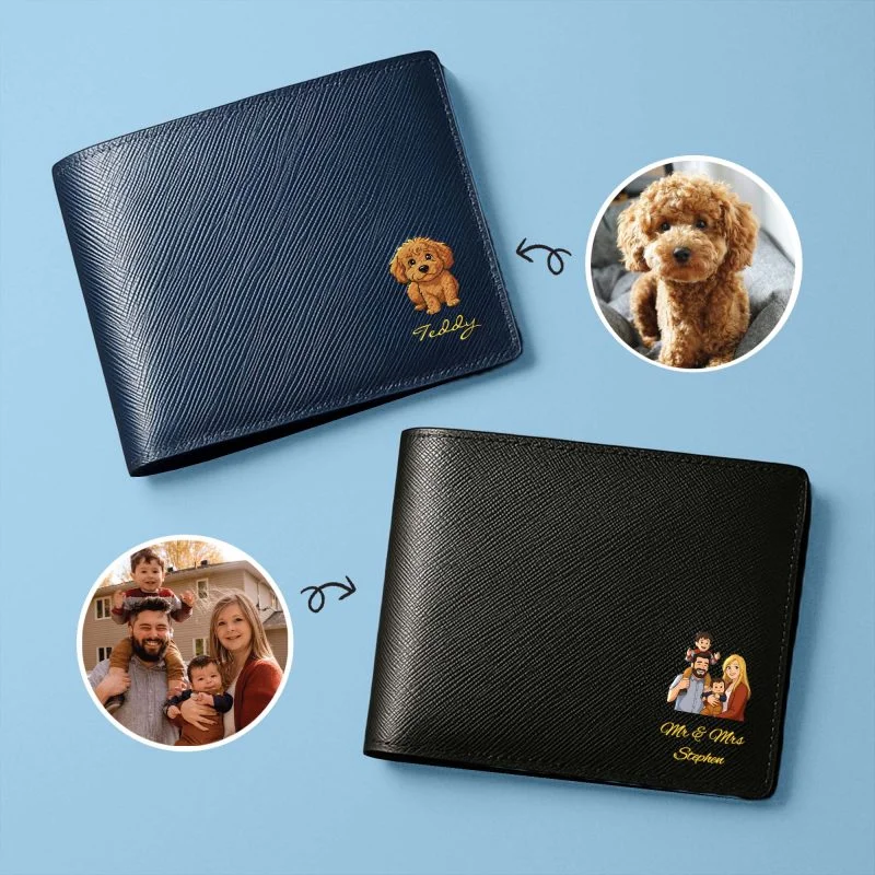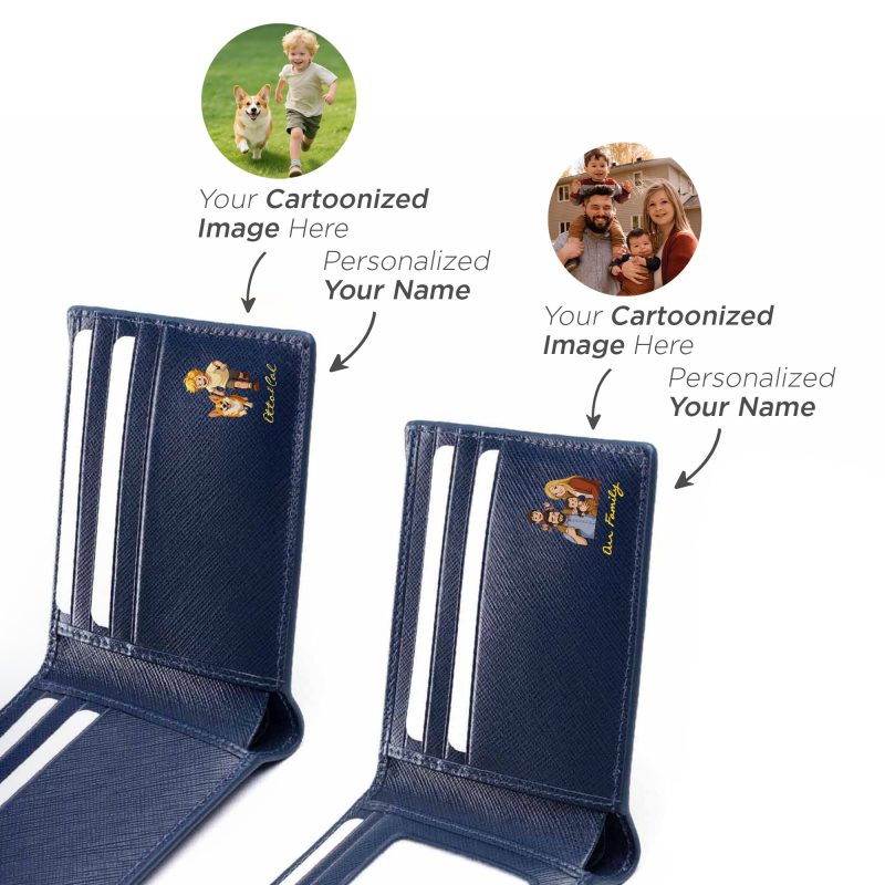 Transform your photo into a personalized leather keepsake and create a truly one-of-a-kind accessory. Simply upload your treasured image, convert it into a cartoon illustration, and let our UV printing technology bring it to life on premium Italian full-grain leather. The artwork blends seamlessly with the leather’s texture, making it a meaningful piece — perfect for gifting or daily use. Description: - Upload your photo and transform it into a cartoon‑style illustration, embossed on leather by full‑color UV printing technology. - Free upgrade to deluxe gift wrapping (gift card and product warranty card included) -  Hand-burnished and beveled edges -  Made of Italian saffiano leather - We respect intellectual property rights. Orders may be cancelled if the uploaded design appears to infringe any copyrights or unauthorized materials. Features: -  2 discreet card slots (4-5 cards for each slot) -  2 compartments for banknotes Option 1 - Photo Slot: -  1 photo slot & 5 credit card slots -  Able to store 13-15 cards Option 2 - Card Slot: -  8 credit card slots -  Able to store 16-18 cards Option 3- Internal coin pocket - 4 credit card slots - 1 internal interior snap coin pouch - Able to store 6-8 cards Production and Shipping Details - Orders will be completed within 1-5 working days - Products can be shipped out the next day - International Shipping